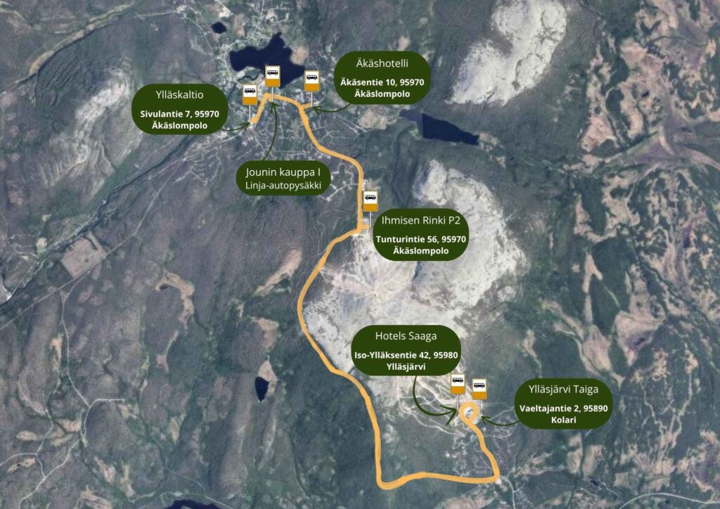 Ylläsjärvi Taiga → Lapland Hotel Saaga, Ihmisen Rinki P2 parkkialue (Äkäslompolo), Äkäshotelli, Lapland Hotels Ylläskaltio (P1 pysäköinti), Äkäslompolo Jounin kauppa I Linja-autopysäkki.