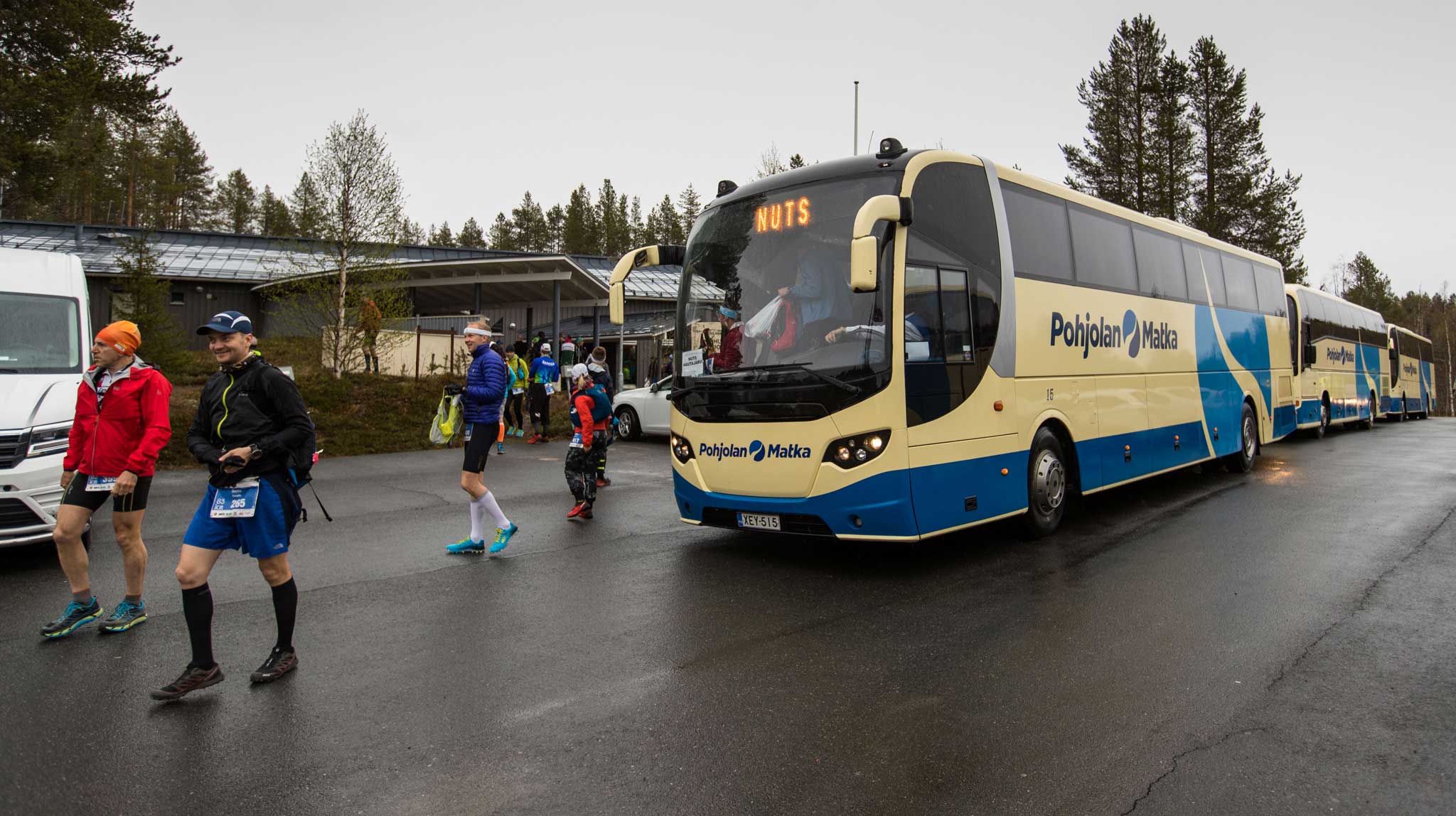 Osallistujabussit Äkäslompolon kisakeskuksesta lähtöpaikoille perjantaina 160 km ja 66 km Hettaan sekä 100 km lähtöön Pallakselle.